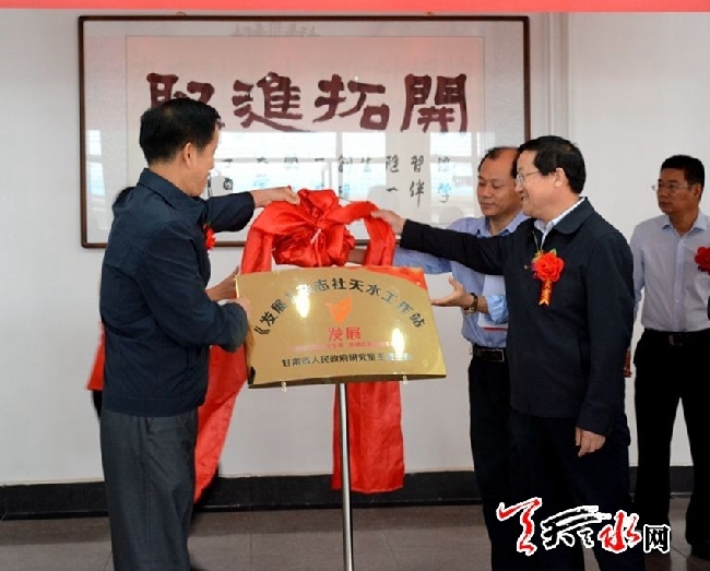 天天天水网讯【记者何郁】8月26日,《发展》杂志社天水工作站在国家开放大学(甘肃)天水学院挂牌成立。省政府研究室副地级巡视员张高平、省政府研究室秘书处处长任立新出席挂牌仪式。市人大常委会副主任蒲朝晖、市政协副主席苏定武为《发展》杂志社天水工作站揭牌。