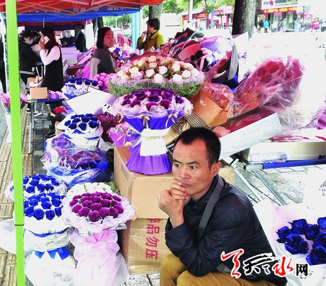 8月28日下午4时,记者在秦州区大众路看到,往年七夕节一片红火的花市在今年变了样,绵绵秋雨中,不仅卖花的摊点比往年少了许多,在此买花的市民也是屈指可数。