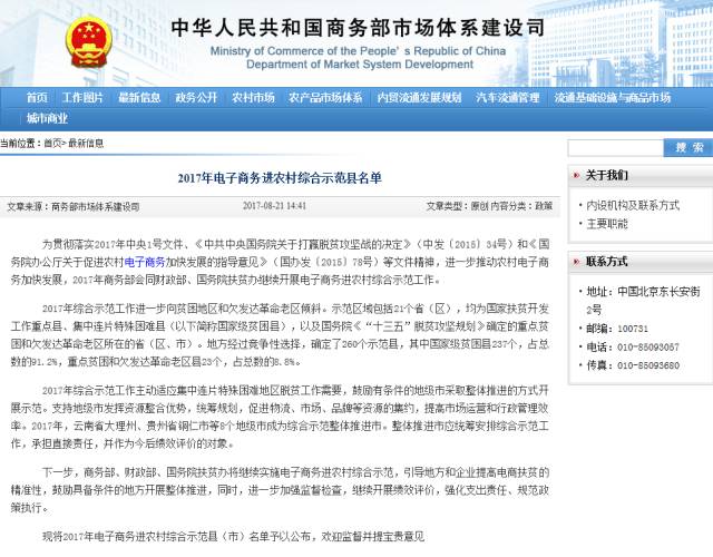 2017年全国电子商务进农村综合示范县名单日前正式公布