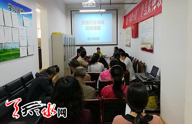 天天天水网讯(通讯员李小霞)为进一步加大打击传销工作力度,营造和谐稳定的社会环境。2017年9月1日,天水郡街道西十里社区在辖区范围内开展打击传销知识讲座活动。
