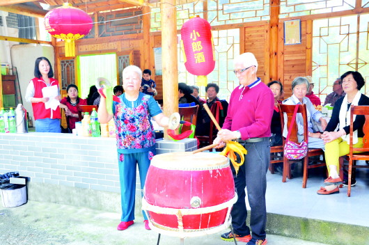鼓手王家安今年80岁,精神抖擞,是这次活动中最活跃的老人,他的搭档石大妈性格开朗,打起锣来干脆利索,一上一下,两人配合十分默契。