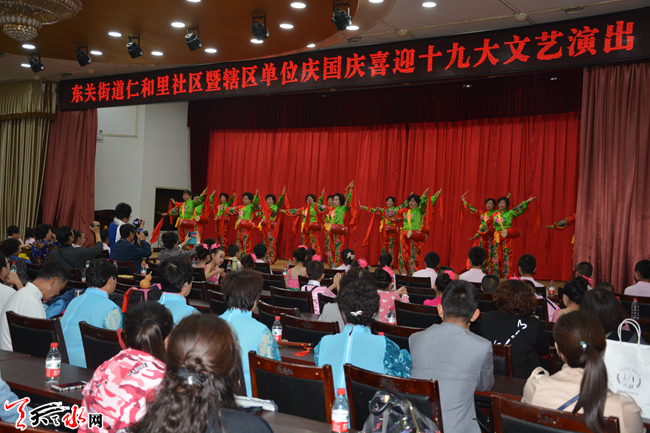 天天天水网讯【记者蔚军平】9月26日下午,秦州区东关街道仁和里社区举办了“庆国庆喜迎十九大”文艺演出,社区干部、居民代表以及辖区单位的演员们欢聚一堂载歌载舞庆祝建国68周年,喜迎党的“十九大”即将召开。