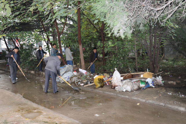 (义务清扫队正在清理计生委家属楼前排污渠的垃圾)