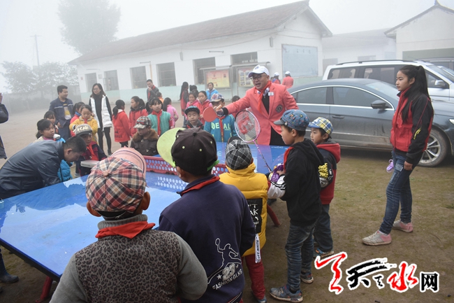 早上10点整,深圳狮子会正道服务队捐赠爱心电教室揭牌仪式正式开始。第一项:少先队员为各位领导及爱心人士佩戴红领巾。第二项:秦安县教体局领导致欢迎词。第三项:深圳狮子会正道服务队会长李学刚讲话。第四项:六图校长周建中介绍基本情况并表达了对深圳狮子会正道服务队自己大爱兰海基金会的感激之情。第五项:深圳狮子会李学刚和教体局相关负责人正式揭牌,六图校长为深圳狮子会正道服务队赠送锦旗。第六项:孩子们集体朗诵《中国少年说》。仪式之后,爱心人士和孩子们进一步交流互动,他们和孩子们一起打乒乓球、羽毛球以及跳绳等多项体育活动.也和孩子们一起载歌载舞,在游戏的过程中,给孩子们赠送水杯以及笔记本作为奖励。孩子们玩得不亦乐乎,大人们也乐在其中。