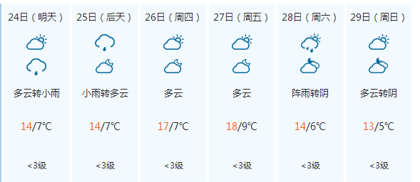 预计未来一周我市阴雨天较少,除24-25日的小雨和28日阵雨外,其余时段均为多云到晴的天气。气温相对稳定,但昼夜温差较大。提醒广大市民朋友及时关注天气变化,注意防寒保暖,适时增添衣物。