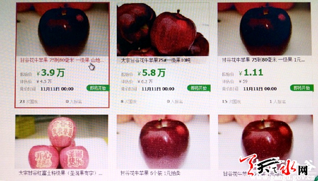 天天天水网讯【记者杨璟】在“双十一”网络促销日之际,甘谷县委、县政府积极与兰州灵犀文化科技有限公司合作,将本地大宗特色农产品——甘谷苹果入驻阿里巴巴网络拍卖平台,成为全省首例、全国第二例在阿里巴巴拍卖农产品的县区。