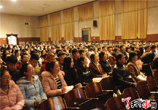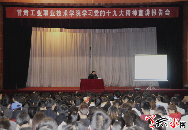 天天天水网讯(通讯员 杨建国)11月14日,甘肃工业职业技术学院集中宣讲十九大精神报告第二场在大学生活动中心举行,该校副校长李玉生为化工、测绘、地质三个学院2016级全体学生宣讲党的十九大精神。各学院党总支书记、副书记、团总支书记及2016级全体班主任参加。宣讲会由该校公共课教学部主任胡森林主持。