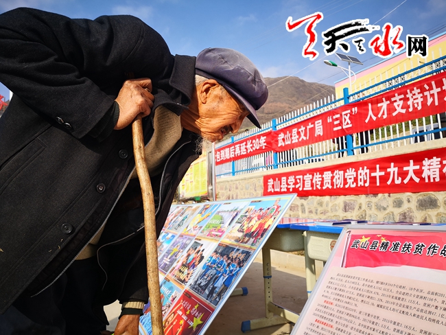 近日,在武山县组织的学习宣传贯彻十九大精神文艺宣传队进乡村活动现场,龙台镇青山村82岁的老党员录茂林拄着拐杖很专注的学习精准扶贫作战目标。老人说,政府给他建了房子,引来了自来水,有了低保和养老保险,这几年他的生活发生了很大的变化,日子越过越好了。作为一名老党员,录茂林把十九大报告读了好几遍,特别是乡村振兴战略和脱贫攻坚工作的总体部署,让他感到十分高兴。古月 摄