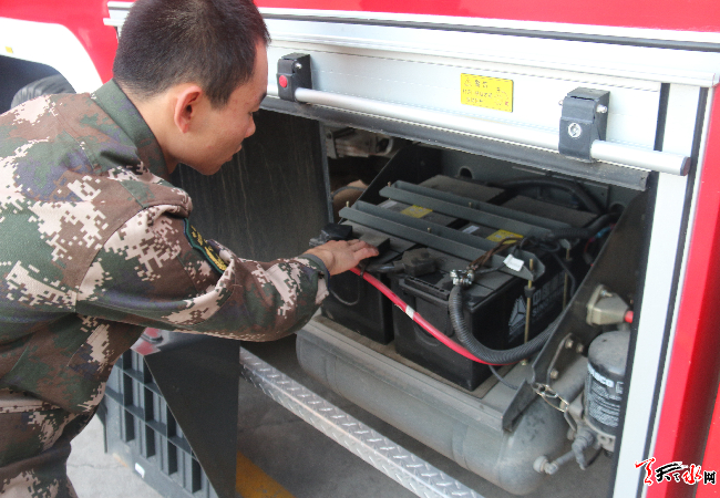 在检查维护过程中,中队官兵严格标准、全面排查,特别针对平时容易出“小毛病”的车辆器材。中队战斗员对随车器材的数量进行清点、性能状况进行测试,并对随车器材的卫生进行彻底清理和擦拭;驾驶员对执勤车辆的各项系统装置进行测试、检验,对缺少的“油、水、电、气”及时进行补充,并根据平时的开车经验对容易发生故障的部位进行重点维护保养。