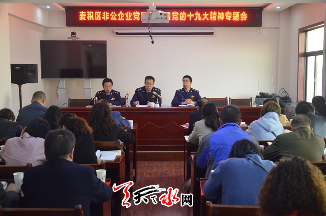 天天天水网讯【通讯员董建强 王智民】近日,麦积区非公企业党工委召开传达学习党的十九大精神专题会议。会议学习了十九大报告、《党章(修正案)》和近平总书记在十九届一中全会上的重要讲话精神,传达省委常委会扩大会议、市委常委会扩大会议及区委常委会扩大会议精神, 36户非公企业的党组织书记参加了会议。