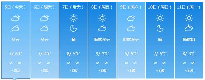 据市气象台预报,5日晴间多云,6日多云,7-10日晴间多云。气温预报以秦州区为例,日最低气温-3~-5℃,日最高气温8~10℃,日平均气温1~3℃。