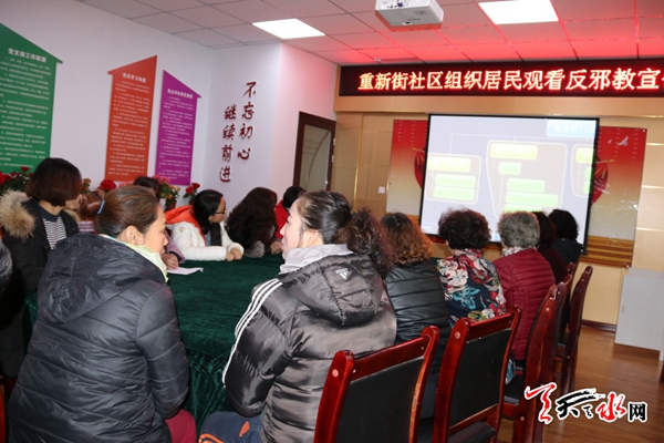 重新街社区组织居民观看反邪教警示教育片,教育片以鲜活生动的例子揭露了邪教组织残害群众的邪恶本质,深入浅出地对邪教的危害进行了剖析。片中触目惊心的案例和惨痛的教训深深触动了观看人员的心。