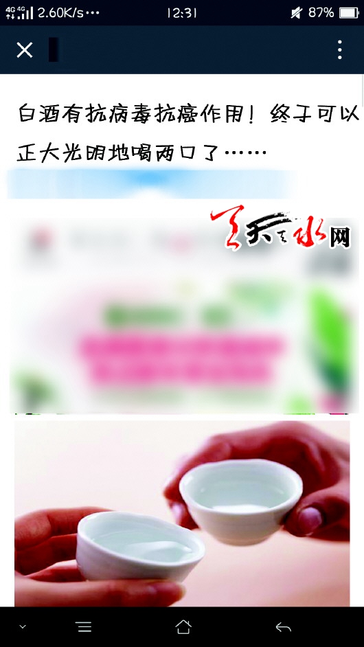 近日,一篇题为《白酒有抗病毒抗癌作用!终于可以正大光明地喝两口了……》的文章在朋友圈中广为流传,点击率颇高,网友也纷纷跟帖留言,更有甚者表示没想到白酒也能抗癌,以后可放心喝酒了。然而,事实真是如此吗?记者调查发现,不但“喝白酒能抗癌”不可信,酒精摄入过量还会致癌。