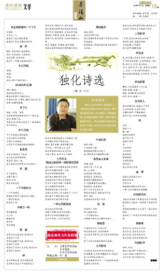 独化,生于1966年,甘肃静宁人。1988年西北师范大学中文系毕业,同年被分配至平凉一中任教至今。诗歌曾被收入沈浩波主编的《2008—2009中国诗歌双年巡礼》、伊沙主编的《新世纪诗典》等。2015年,由长江文艺出版社出版诗文集《沉香》。