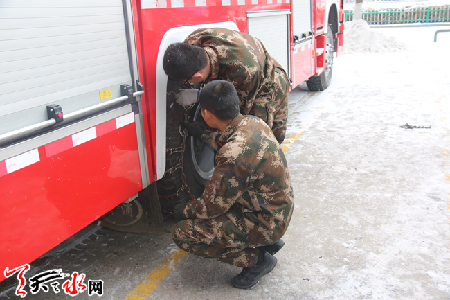 天天天水网讯(通讯员 景辽强)1月24日上午,天水市公安消防支队七里墩队官兵正在为执勤消防车辆安装防滑链。