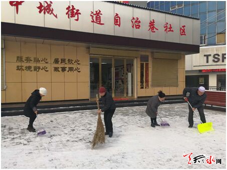 天天天水网讯(通讯员 安冬梅) 1月24日我市迎来一场降雪,天寒地冻道路积雪,虽然缓解了近期干燥的空气,却给广大居民的出行和生活带来了不便。为了保障广大群众的安全出行,今天早上,中城街道自治巷社区组织干部和志愿者开展了清雪工作。大家分工合作,拿着铁锹、扫帚清扫人行路面的积雪。经过努力,很快把巷道和社区前面的道路面清扫干净。降雪虽然给居民的出行造成了很多的不便,但是在整个扫雪过程中,大家深深感受到了社区工作人员与志愿者们的志愿精神,特别是党员干部带头奉献,服务于民,为居民的出行安全提供了有力的保证,也给我们自治巷社区增添了一抹亮色。