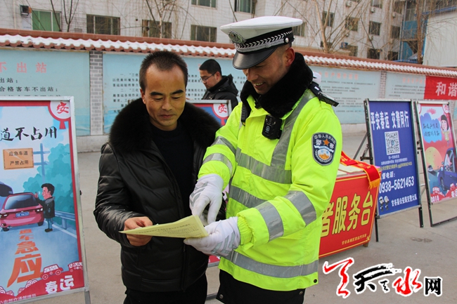 天天天水网讯(通讯员 姚宏博)为营造安全、畅通、文明、和谐的春运道路交通环境,2月1日上午,天水市公安局交警支队新兴高速公路大队举行了2018年“平安春运•交警同行”主题宣传活动。