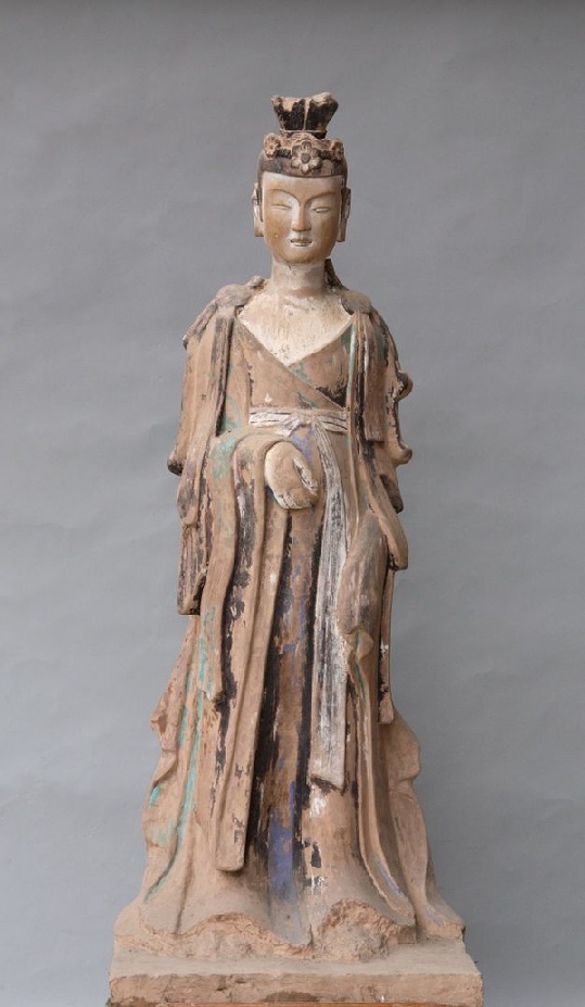 塑像位于窟正壁左侧。头戴花蔓高冠,面型饱满丰润,弯眉细目,直鼻,薄唇,嘴角内敛。着低胸交领束腰长衫,宝缯自双肩分披下垂。左臂屈肘自然下垂,右手持贴于腹前。身躯窈窕、委婉多姿,服饰层次清晰、厚重富于质感,华丽的服饰体现了其身份的高贵,沉思下的双眼,含笑的神态,深刻地塑造出菩萨女性般的温柔与恬静,给人以高雅、豁达之感。为西魏菩萨代表之作。