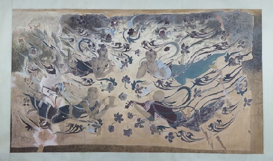 绘于窟龛上方,大型飞天七幅之一。画面两组飞天,相向而飞,有的手执乐器演奏,有的手捧供物飞舞,自由自在地飞旋于鲜花与祥云的虚空之中,一幅欢快祥和的动人场面。别出心裁,独具一格的表现形式不仅轻盈优美,增加了人物的流动感,也体现了作者卓越的智慧与丰富的想象力。天人的脸部和肌体部分均为薄薄一层优质细泥塑出,其他如衣着、飘带、饰物及周围的流云、花饰等,均彩绘而成。将立体雕塑和平面绘画珠联璧合地结合在一起,创造性地绘制出了“薄肉塑”飞天壁画,具有“呼之欲出”之感,在中国石窟壁画中独此一处,成为中国石窟壁画中的经典之作。