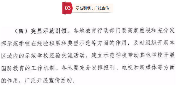 加强国防教育,增强国防观念,使关心国防、热爱国防、建设国防、保卫国防成为全社会的思想共识和自觉行动。以立德树人为根本任务,将国防教育纳入国民教育体系,在课堂教育教学、综合实践活动和专题教育项目中融入和加强国防教育,切实提高学校国防教育工作质量。以提高青少年综合国防素质为基本要求,着力强化育人功能,着力创新方式方法,着力加强条件保障,健全校内校外密切结合的学校国防教育网络,促进学校国防教育与德育、智育、体育、美育有机融合,大幅提高国防教育的国防贡献率、校园吸引力和育人实效性,促进青少年健康成长。