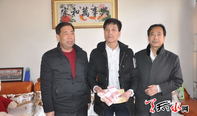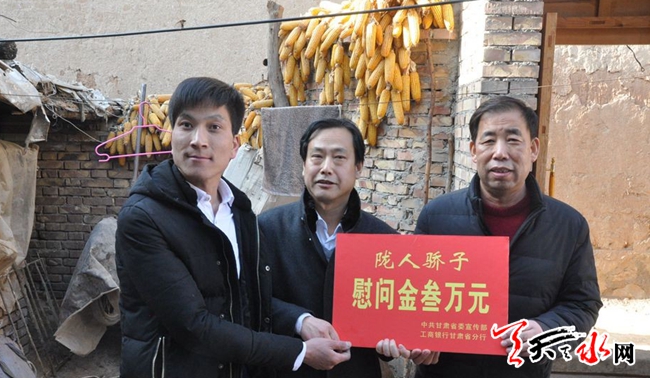 天天天水网讯【记者闫波】2月12日,受省委宣传部、工商银行甘肃省分行委托,市委宣传部、工商银行天水分行相关负责人赴武山县鸳鸯镇盘古村,看望慰问“陇人骄子”包永弟,表达了新年的问候和祝福,转达了党和政府对“陇人骄子”的关心关爱,并送上了3万元慰问金和米面油等生活用品。