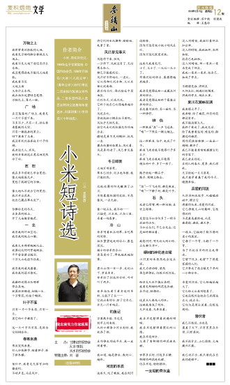 小米,原名刘长江,1968年生于甘肃陇南,中国作协会员。1986年开始在《大家》《人民文学》《青年文学》《诗刊》等近二百家报刊发表文学作品,二百多篇作品入选百余种诗文选集和年度选本,出版诗集《小米诗选》《十年诗选》。