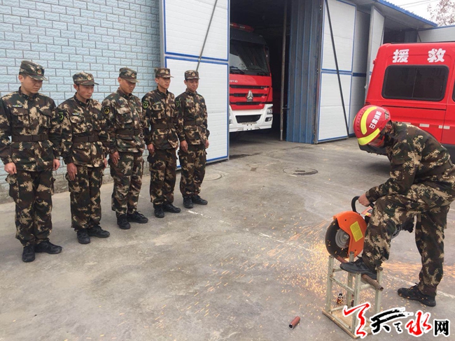 训练过程中,专职消防队员重点就电动破拆工具组、无齿锯、空气呼吸器材等主要技术参数、功能用途、使用方法、注意事项以及如何维护保养等实地操作训练。