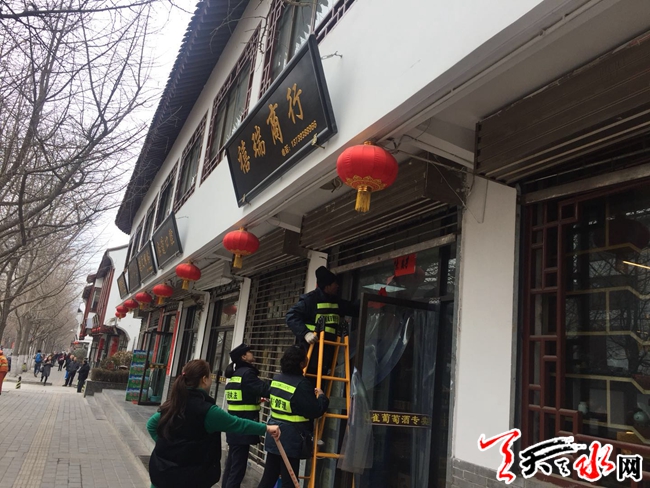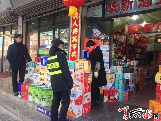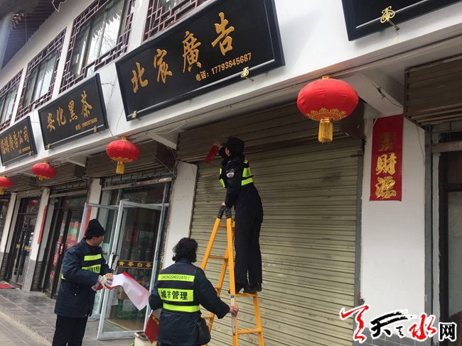 为维护天水城区良好的市容市貌形象,着力将青年南北路打造成“无乱贴乱挂、无店外经营、无流动摊点、”的管理精品街、示范街、样板街。女子分队对青年南北路实行了不间断巡查管理工作模式,针对青年南北路125家店铺年后对联清理工作逐一进店进行宣传并摘除。同时对管辖区域内违停机动车辆加大了督查处罚力度,对占道非机动车做到即时发现即时规范,真正做到了还路于民。