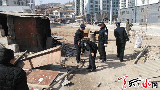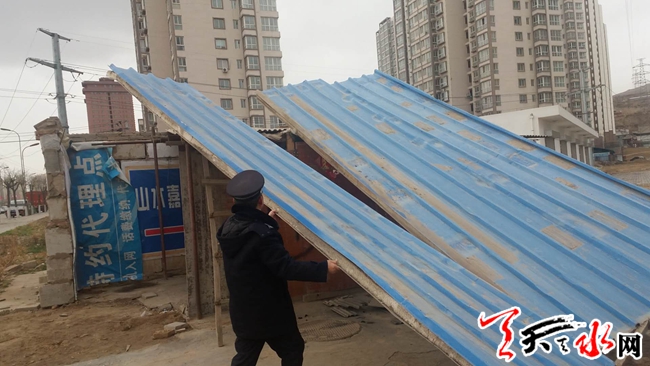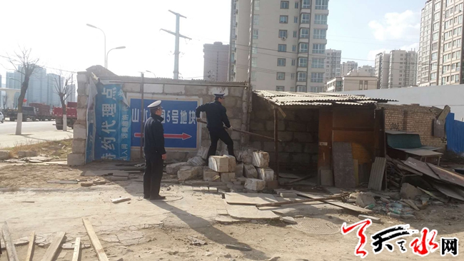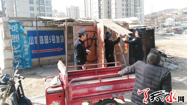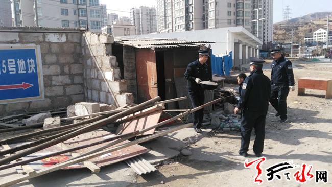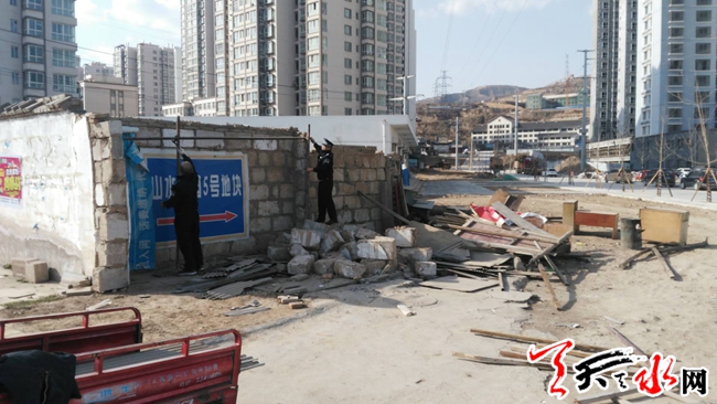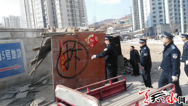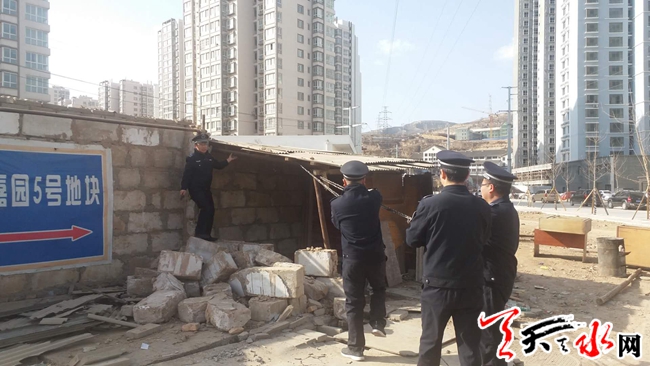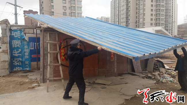 2018年2月12日,秦州执法局接到群众举报电话,王家磨养老院路口有人私自搭建违章建筑,接到举报后,该局机动一中队立即召集人员现场调查,经调查当事人周某系当地居民,自2010年起陆续在王家磨养老院路口用简易木材、石棉瓦等建材私自搭建居住棚房,搭建面积60余平方米。2017年底,周某又在简易棚房旁边搭建30余平方的钢构房屋用于开设小卖铺进行营利。周某搭建这些房屋未经任何单位批准,属于违法建筑。而且周某违法建筑紧靠山水家园工地围墙,严重阻碍山水家园项目建设的正常开展。为此,执法局机动一中队执法人员对周某进行了城市管理法律法规宣传,并向周某下发了限期拆除棚房的法律文书,责成其自行拆除。