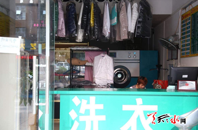 记者在这家洗衣店看到,只有30多平方米的店面里挂满了各式各样的衣服,店里的机器在忙碌地转动着,两个店员也正跑前跑后地忙碌着。记者在洗衣店门口站上10分钟,就有四五位顾客进门。