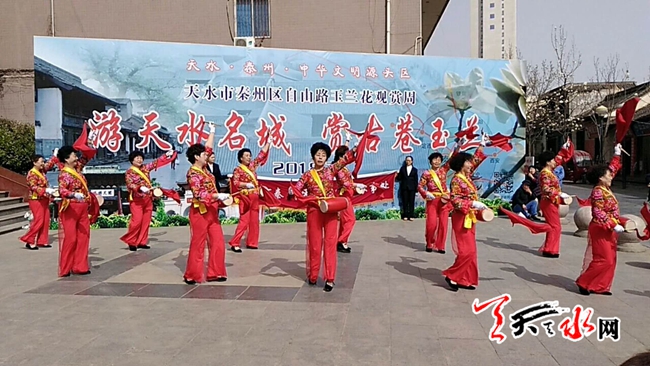 天天天水网讯【通讯员张彬】为积极响应秦州区举办的以“游天水名城、赏古巷玉兰”为主题玉兰花观赏周活动,3月20日下午,秦州区中城街道绿色市场社区妇联联合工会特邀辖区妇女腰鼓队在自由路开展文艺演出,为古巷玉兰增添了另一抹色彩。