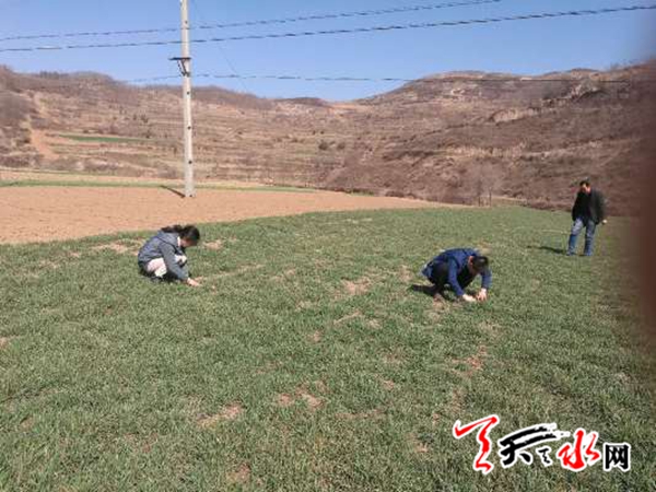 日前,秦州区齐寿镇一冬小麦田里,秦州区农业局的专业技术人员在查看冬小麦返青前的病虫害发生情况。