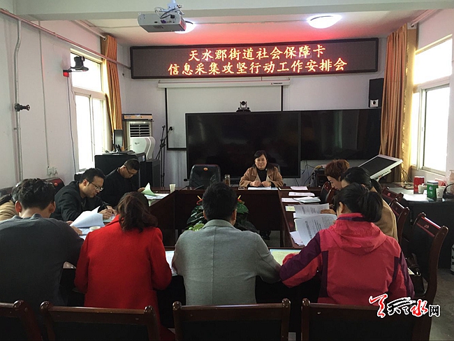 天天天水网讯(通讯员 杨昭)为认真贯彻天秦人社[2018]45号文和天秦人社[2018]46号文文件精神,3月20日上午,天水郡街道召开社会保障卡信息采集攻坚行动工作安排会,街道办事处副主任赵双萍、街道社保所工作人员、各社区专干参加了会议。