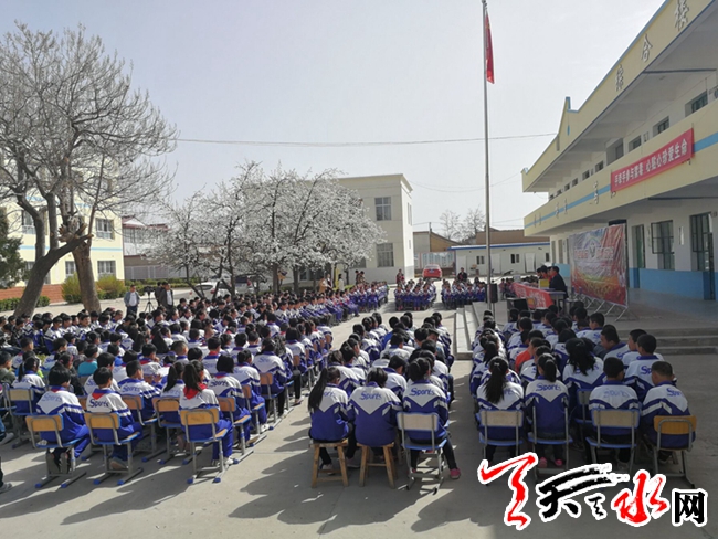天天天水网 为深入推进毒品预防教育“6.27工程”的开展,增强青少年学生识毒、防毒、拒毒意识,根据局党委的安排部署,4月3日,县禁毒办联合大石派出所深入甘谷县王川九年制学校开展青少年毒品预防教“6·27”工程进校园活动。县公安局副局长、县禁毒办主任范朝林,县禁毒办副主任宋松萍,县公安局大石派出所民警王新昌,县禁毒办全体民警,大石学区党支部书记李友林,王川九年制学校党支部书记王昌林、副校长王全福、教导主任王全林及王川九年制学校全校师生共计600余人参加了此次活动。