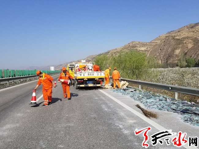 天天天水网(通讯员 胡泽庭)2018年4月3日早6时,天水公路管理局高养中心武山养护工区在巡查时,发现G30线连霍高速公路天定段上行线1401+700处,一辆拉运玻璃半挂车和一辆拉运食品材料半挂车发生刮擦碰撞事故,拉运玻璃车玻璃洒落在超车道、行车道和应急车道路面,洒落长约200米,主要为破碎玻璃片和玻璃渣。天水公路管理局高养中心养护职工迅速摆放反光锥桶布设安全作业区,安排四名养护职工配合高速交警做好后方车辆的安全示警工作。养护职工先将大块玻璃装车,清理出一条通道,让后方排队车辆缓慢谨慎通过。事故车辆被拖离现场后,立即全面清理路面碰撞洒落碎片等杂物,并做好交通疏导,指挥车辆缓慢有序通过。
