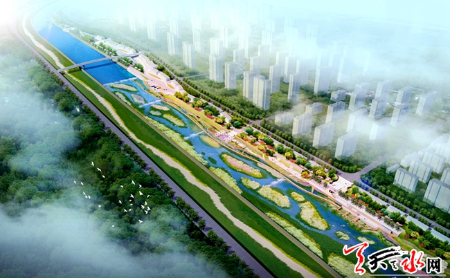 本次整治河道划分为蓄水区、生态湿地区两部分,河道规划按“3段湿地+2段蓄水”景观治理总布局。蓄水区采用中隔墙将河道分为两大部分,北侧为景观蓄水区,南侧为泄洪槽,共布设8座拦水坝,其中蓄水区6座橡胶坝;生态湿地区总长度3.77千米,总面积71.3万平方米(1070亩),分为三段,其中,上段湿地景观区及中段湿地景观区以恢复河道自然功能为主,融入“海绵城市”理念,形成功能丰富兼具观赏价值的河流湿地景观区;下段湿地通过对滩地人工修复形成生态公园,结合文化、体育、休闲娱乐等城市功能,打造为市民闲暇之余亲水娱乐的休闲场地。
