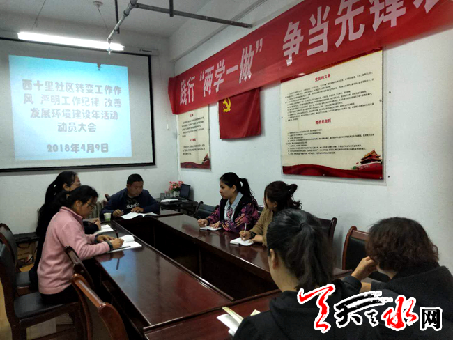 天天天水网讯(通讯员汪文惠)4月9日上午,天水郡街道西十里社区召开了开展转变工作作风严明工作纪律改善发展环境建设年活动动员大会,安排部署开展转变工作作风严明工作纪律改善发展环境建设年活动工作。社区分管领导刘海生主任、全体社区干部职工共11人参加。会议由社区党总支书记汪文惠主持。
