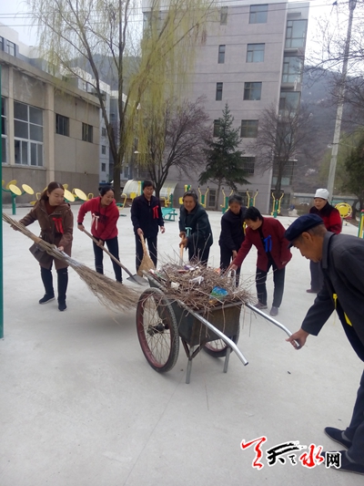 天天天水网讯【记者杨旭】4月12日,秦州区天水郡街道皂郊路社区组织辖区“五彩丝带”志愿者、居民对社区卫生死角、公共设施等进行了集中清理。