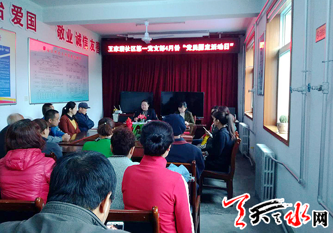 天天天水网讯(通讯员吴娟)4月13日“党员固定活动日”,王家磨社区各党支部组织党员深入开展了学习新修订的《中华人民共和国宪法》、习近平在第十三届全国人民代表大会第一次会议上的讲话、王锐在市委办公室机关党委第一支部组织生活会上的发言、雷鸣同志在区委工作会议上的讲话。