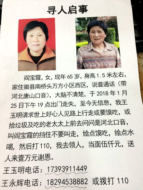 中午,老人路过新华路一面馆时,拿出自己随身携带的杯子,向服务员要了一杯水后,坐在马路边上一边擦汗,一边掏出包里有些发霉的馒头吃了两个。随后,他时不时地在电线杆和墙壁上,贴上了寻人启事:“阎宝霞、女,65岁,身高1.5米,家住徽县南桥头万方小区西区,说普通话(带河北唐山口音),于2018年1月25日下午19时出门走失,至今无信息。我王玉明请求世上好心人见路上行走或要馍吃,或拾垃圾吃的老太太上前去问问是河北口音,叫阎宝霞的挡住不要叫走,给点馍吃,给点水喝,然后打110,我去领人,当面伍千元,送人来壹万元。”
