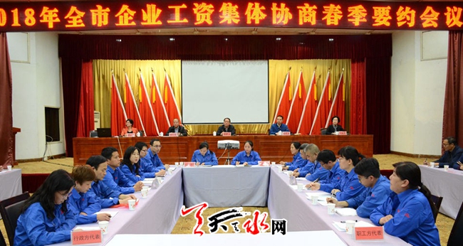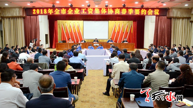 天天天水网讯【记者闫波】4月20日,2018年全市企业工资集体协商春季要约会议召开,安排部署全市工资集体协商春季要约工作,并为获得甘肃省第四批集体协商示范单位的四家驻市企业进行了授牌。