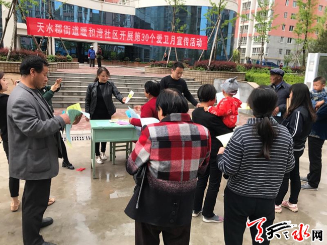 天天天水网讯 2018年四月是全国第30个爱国卫生月,为深入开展全域无垃圾创建,倡导健康文明生活方式,进一步改善城乡环境卫生面貌,提高居民文明健康素质。4月20日上午,天水郡街道暖和湾社区开展了以“关注小健康 共享大健康”为主题的爱国卫生月宣传活动。