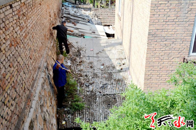 该处卫生死角位于海林南厂家属院与玉泉镇李家村交界处,由于疏于管理、村民随手丢弃的恶习,在南厂平房顶及护坡绿化带上随处可见生活垃圾,严重影响环境卫生。海林社区主任第一时间清查现场,在保障安全第一的情况下,安排身手矫健的志愿者沿平房承重墙上房,利用铁锹、竹棍、扫帚等工具逐片清扫房顶垃圾。同时安排志愿者用火钳子夹出护坡垃圾。经过两个多小时的努力,卫生死角面貌焕然一新。