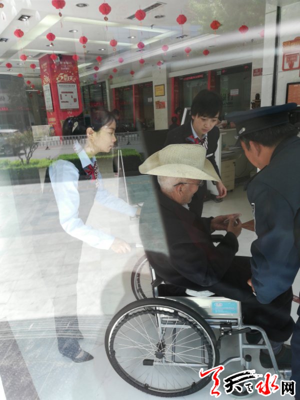 天天天水网综合讯 4月27日,网友张小去甘肃银行天水分行办业务时,看到了这个画面,令他感动,于是将这暖心一幕拍了下来。据了解,这位退休老人要在甘肃银行激活社保卡,因为行动不便,得到了甘肃银行工作人员耐心细致热情的帮助,老人内心十分感动!同时银行工作人员纯朴的服务也感动着周围办理业务的群众。