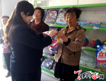 天天天水网讯(通讯员吴娟)4月26日上午,天水郡街道王家磨社区慈善超市开展了2018年第一季度爱心积分兑换活动,向热衷社区公益活动的居民志愿者和老党员回馈了爱心物品。