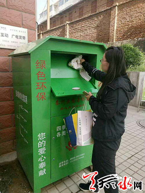 天天天水网讯(通讯员吴娟)近两年,王家磨社区的每个小区出入口附近都设置了爱心衣物回收箱,箱子上面写着“四季服饰、鞋帽”、“绿色环保、美化城市”等字样。