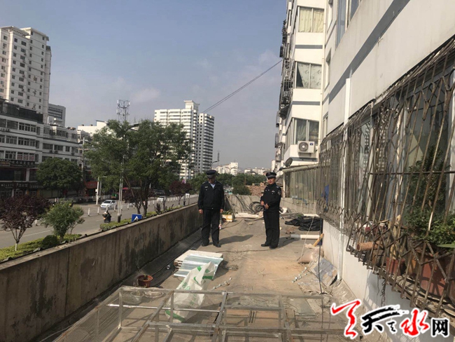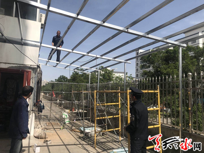 天天天水网讯(通讯员 赵懿)5月2日,秦州区执法局机动一中队执法人员巡查绿色市场辖区时,发现绿色市场商住楼B号楼二楼有人正在搭建钢构棚。经调查核实,当事人未取得任何审批手续,且占用公共空间私自搭建建筑物,存在严重的危险隐患。