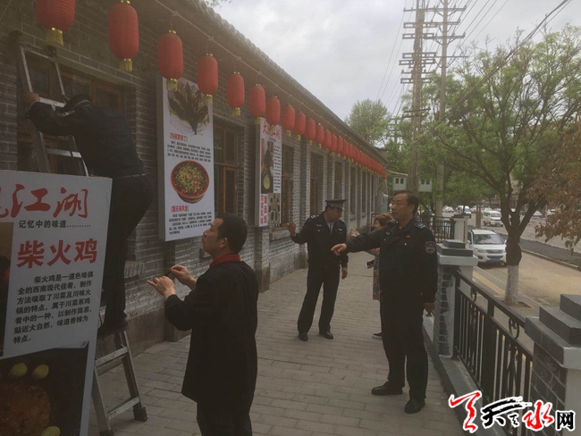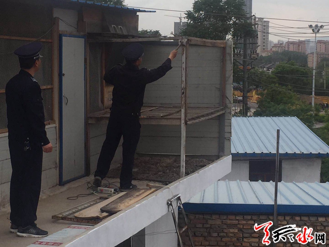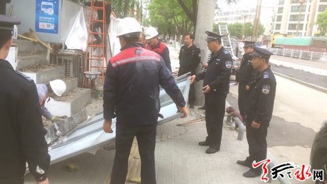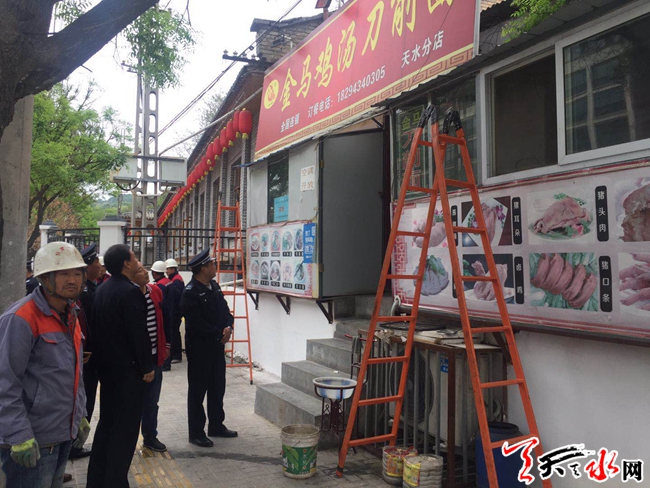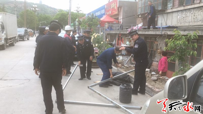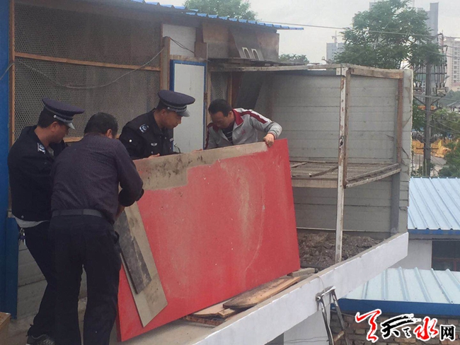 天天天水网讯【通讯员 沈彦斌】为进一步规范城区环境秩序,提升城市品位,根据区委、区政府关于羲皇大道(秦州段)环境提升改造工程的相关要求,区执法局机动二分队在局党组的统一安排部署下,从5月4日开始,依法对羲皇大道沿线两侧建筑及海林厂南家属区建筑外立面擅自设置的各类违章户外广告、门头牌匾和乱搭建的各种违章建筑物、临时构筑物进行集中拆除。