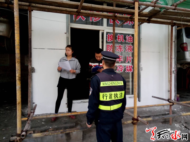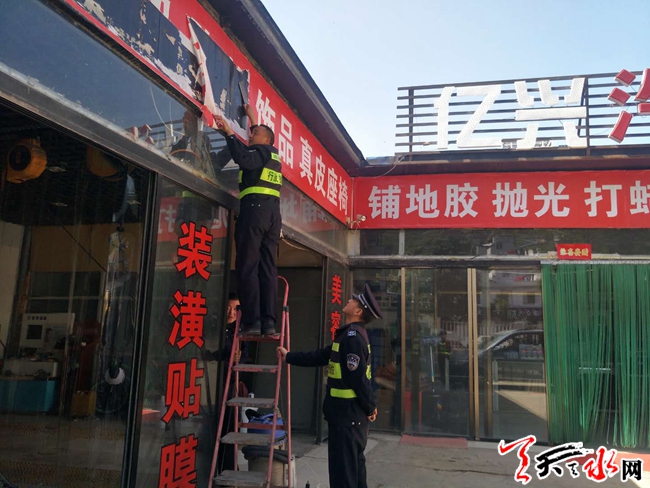 天天天水网讯【记者杨旭】近日,秦州区执法局七里墩中队对辖区羲皇大道东段沿街100余家商铺的门头牌匾、户外广告及乱搭建的防盗网、晾衣架、花架等进行了整治。