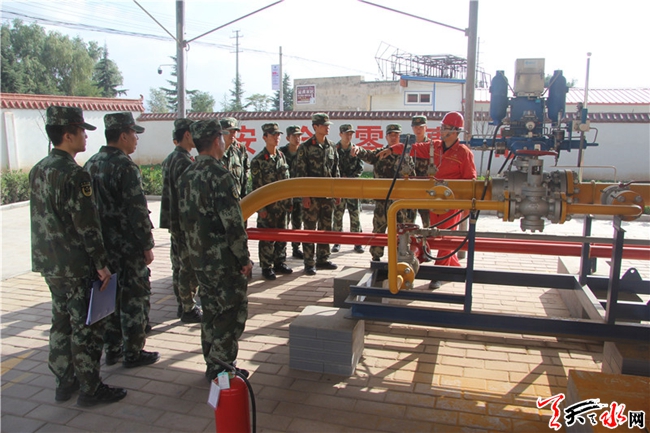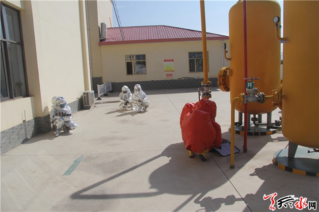 首先,中队官兵在该加气站负责人带领下对加气站进行了详细的了解,同时指挥员进行了火情设置和战斗分工。演练假设:加气机由于工作人员操作不甚引发火灾,工作人员发现后,立即关掉气阀并拨打119,同时在场工作人员利用站内的干粉灭火器对着火部位实施灭火抢救。消防官兵到场后,指挥员根据侦察情况,果断下达了作战命令,一组人员负责现场警戒和侦检,封锁事故路段交通,隔离围观群众,严禁无关车辆及人员进入“火灾”现场。另一组人员出两支枪,一支负责主攻灭火,一支负责对邻近加气机和营业厅建筑进行冷却,防止火灾蔓延。随着命令的下达,各小组迅速对“大火”发起总攻。经过近20分钟的紧急“扑救”,加气站“火灾”被成功扑灭,圆满完成任务。